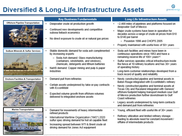 Genesis is an energy infrastructure MLP. It generates roughly 42% of its operating income from offshore pipeline transportation, 36% from sodium minerals and sulfur services, 16% from onshore facilities and 6% from marine transportation. It has a market capitalization of $2.7 billion.