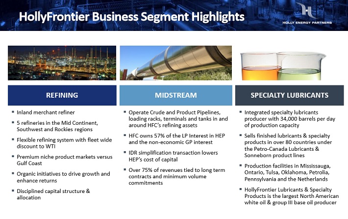 Holly Energy Partners is an oil and gas Master Limited Partnership, or MLP. The company operates its own crude oil and petroleum pipelines and storage terminals in ten U.S. states, including Texas, Nevada and Washington. HEP also has refinery facilities in Utah and Kansas. HEP was founded in 2004 by HollyFrontier (HFC) and generates revenue by charging customers a fee for transporting and storing petroleum products.