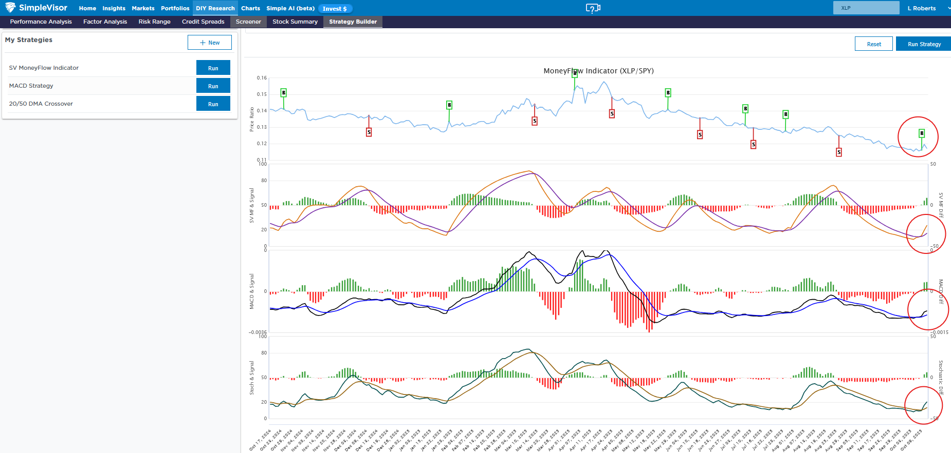 The graph below, courtesy of SimpleVisor, does technical analysis on the ratio of the Staples (XLP) to the S&P 500 (SPY). The blue line in the top graph is the price ratio of the two. As shown, staples have consistently underperformed the market since the April lows. Given that staples and other more conservative sectors tend to underperform in upward trends and relatively outperform in downward trends, it is worth appreciating whether the relationship between XLP and SPY is changing. The bottom three graphs indicate that various stochastic studies on the price ratio are all generating buy signals from their lowest levels in at least a year. This raises the question of whether the buy signal is durable or just a short-term bounce, largely due to the big sell-off last Friday.