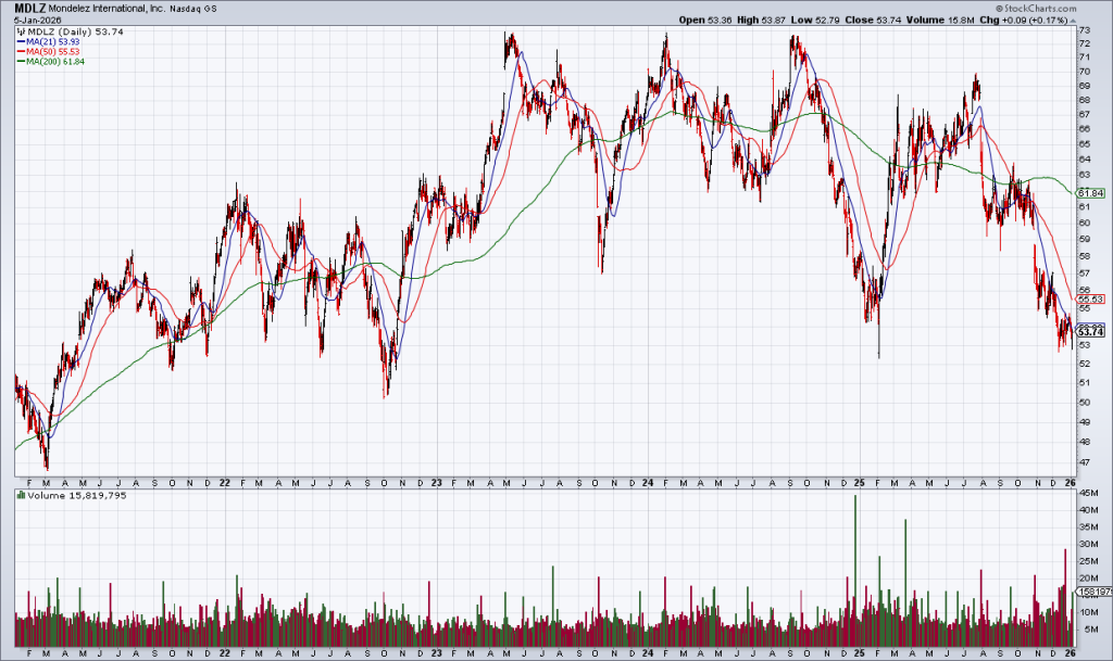 Applying a growth rate of -15% to 2025 Adjusted EPS and 7.5% to 2026 works out to $3.07 Adjusted EPS next year. At Monday’s closing price of $53.74, that’s 17.5x. MDLZ also pays a 50 cent quarterly dividend which is 3.72% annualized.