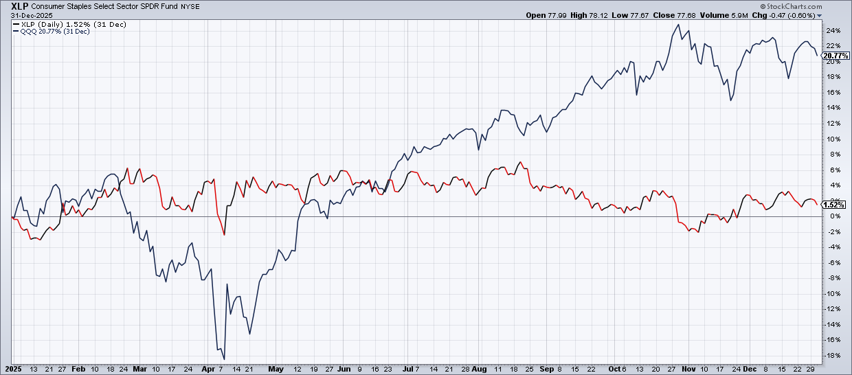 Consumer Staples (XLP) were essentially flat in 2025 but – along with healthcare – are generally the best defensive stocks in difficult markets. While Tech could well continue to run hot in 2026, I personally think it’s a good time to play a little more defense than last year.