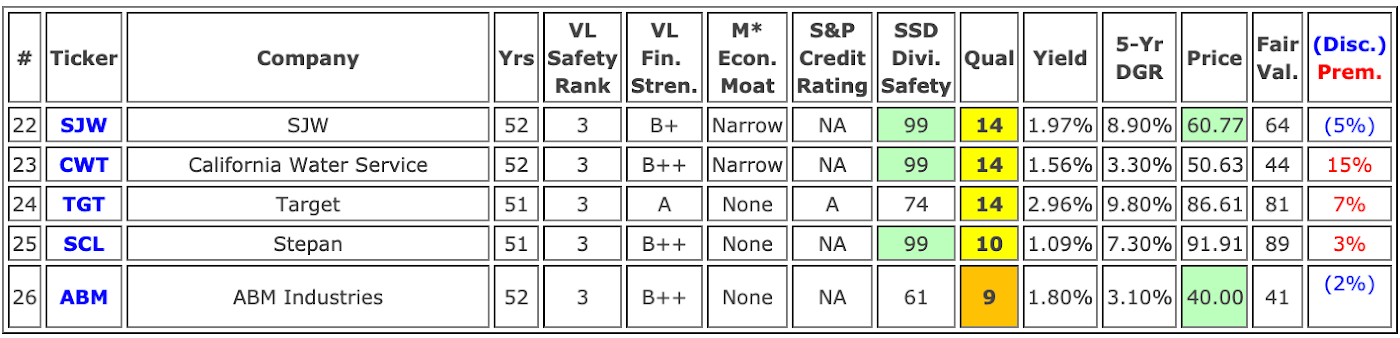 In addition to quality indicators and quality scores, I provide columns with key metrics of interest to dividend growth investors, including years of consecutive dividend increases (Yrs), dividend Yield for a recent Price, and 5-year compound annual dividend growth rate (5-Yr DGR).