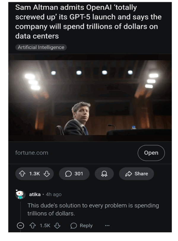 This will come apart at the seams. The federal government will step in citing "national security" just like they saved financials in 2008. They're already investing in companies like Intel. We might be nine months to a year from OpenAI being partially owned by the federal government.