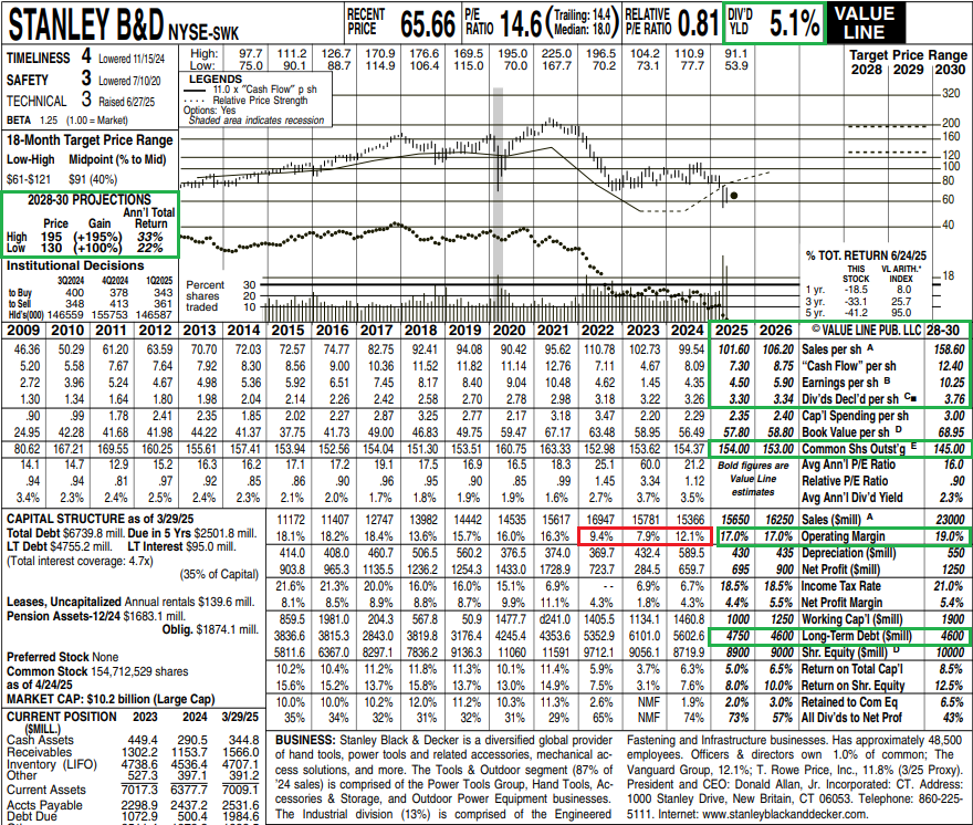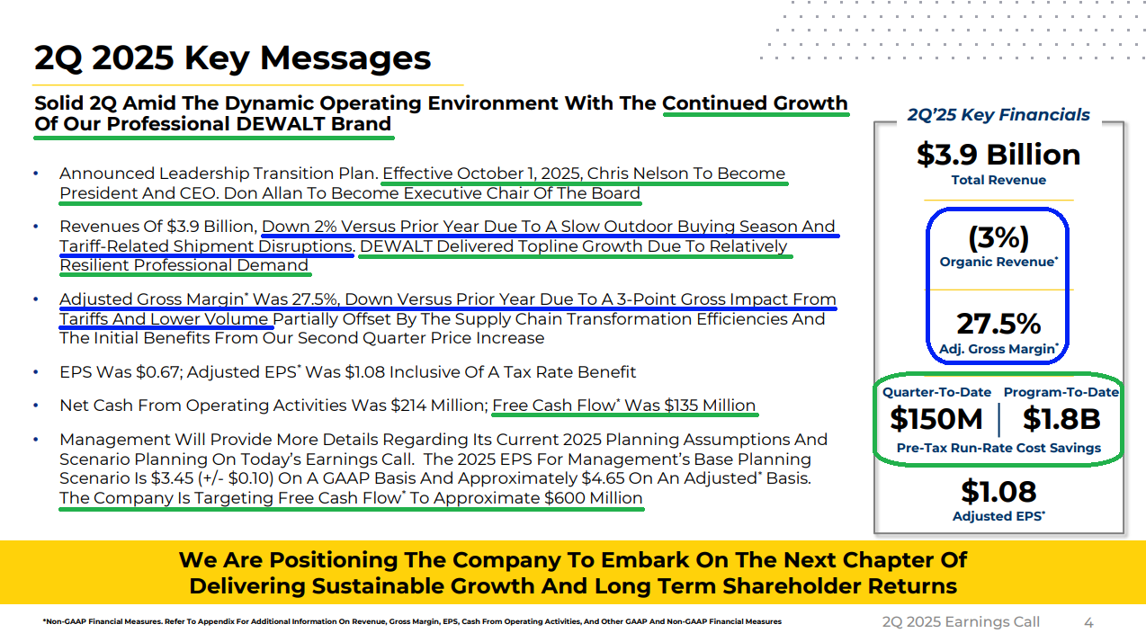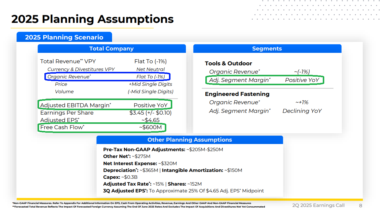 7) SWK delivered $135 million of free cash flow in Q2, well below the $486 million generated in the prior year but a solid result given the operational impact of new trade policies. Most importantly, management continues to expect ~$600 million in free cash flow for the full year, with proceeds used to fund the dividend and excess cash earmarked for debt repayment. Management remains focused on reaching its 2.5x net leverage target, with deleveraging the balance sheet still a top priority. An additional $500 million to $1 billion in portfolio pruning is expected to support further debt reduction.