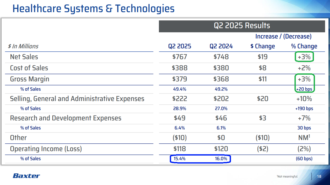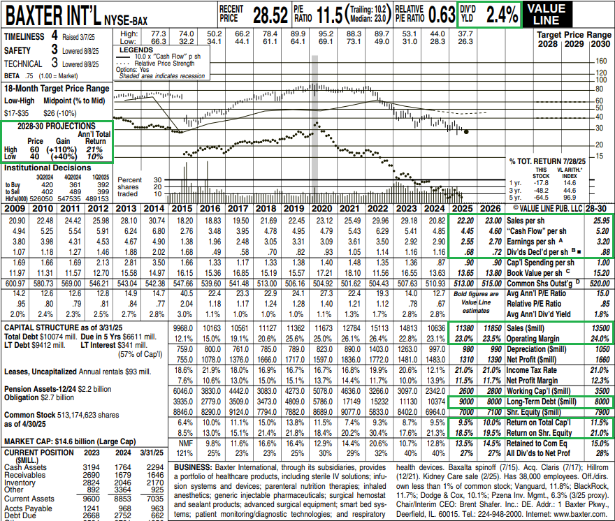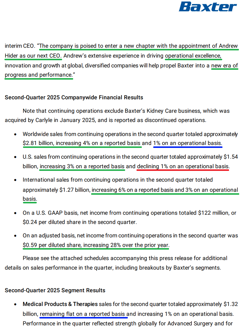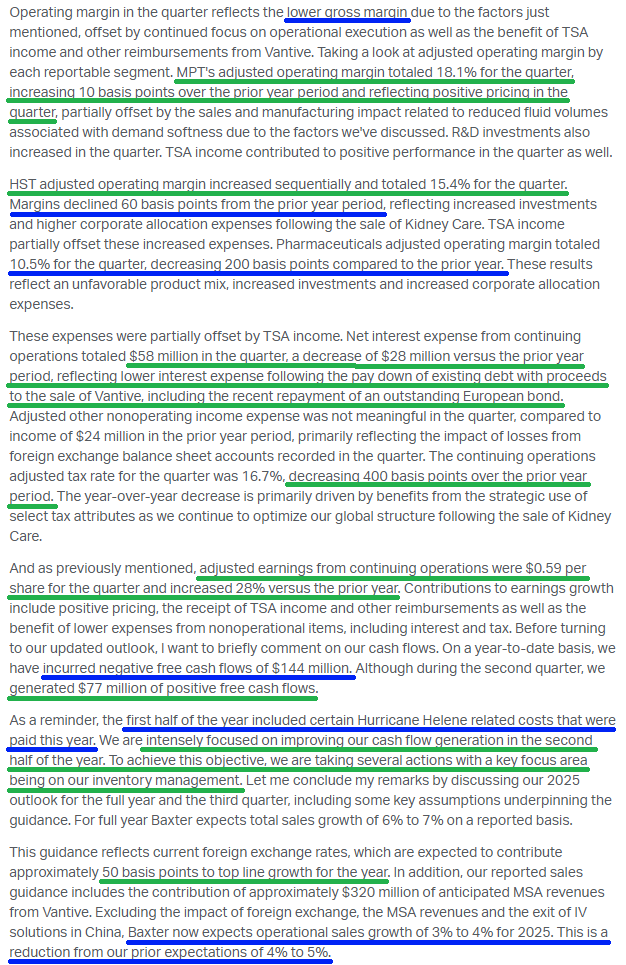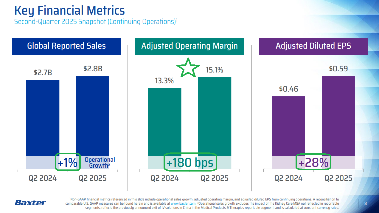 In the case of Baxter, we think a couple of clean quarters of solid execution and proof that they can get back to the 4-5% growth range will go a long way. Management still sees a clear path back to high teens operating margins and has already made solid progress, improving from a trough of 14.3% in 2023 to 15-16% this year.