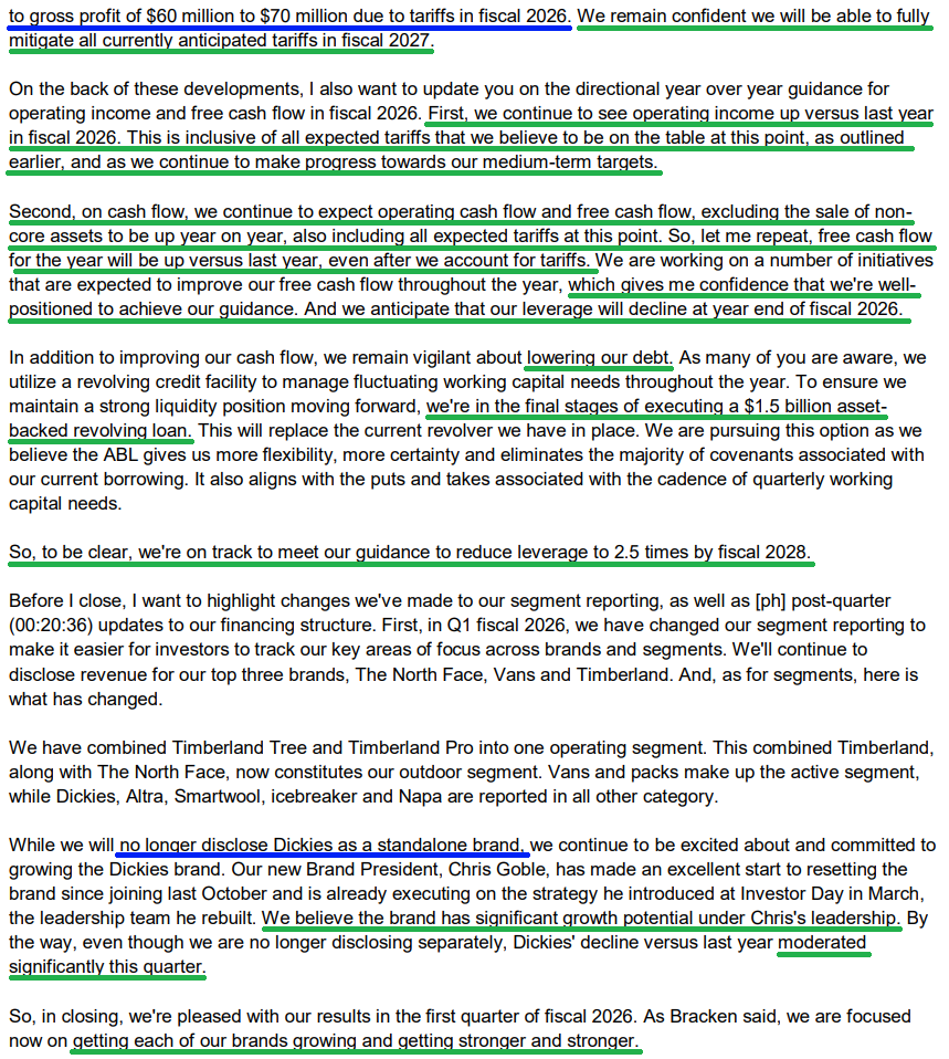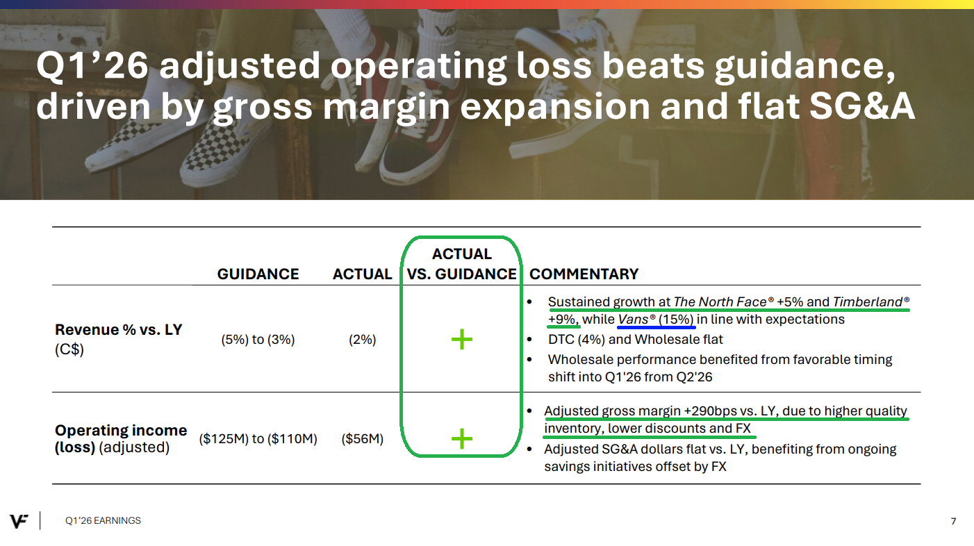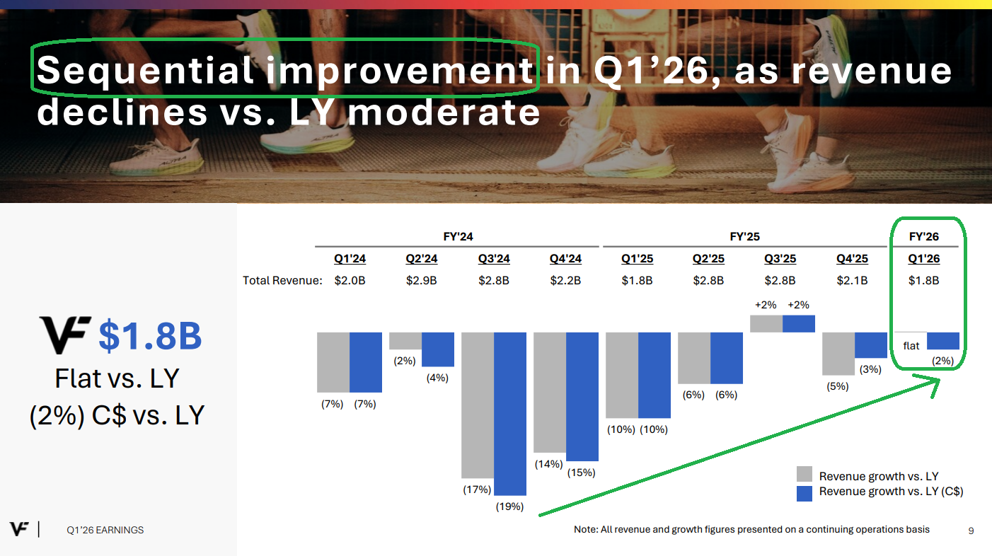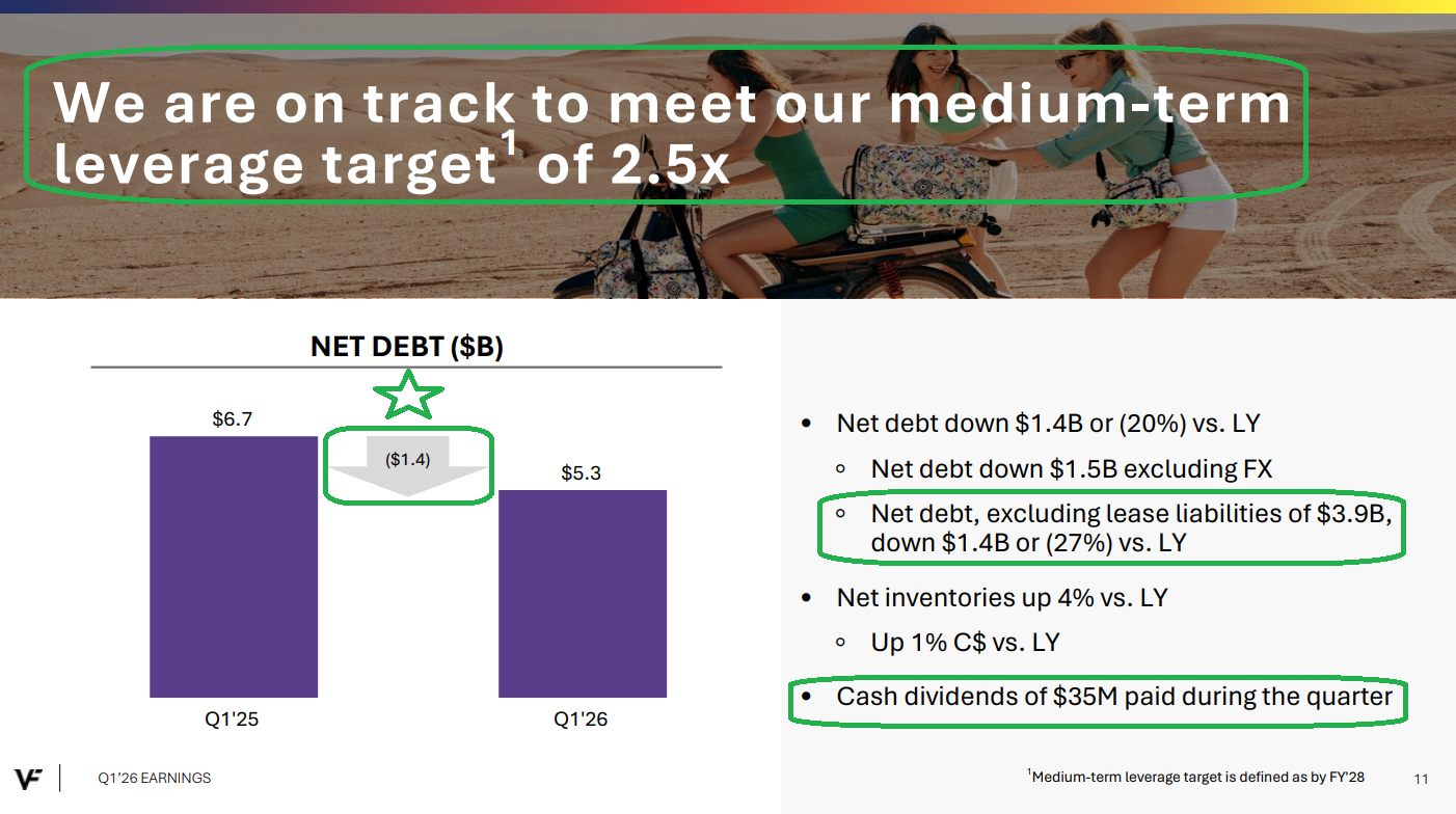 4) Net debt was down $1.4 billion, or 20%, compared to last year as management remains on track to achieve the medium term leverage target of 2.5x by FY2028. VFC ended last year at 4.1x and expects to be below that by the end of this fiscal year, with the ~$500 million bond expected to be paid down at year-end using free cash flow and other short term borrowing if needed.