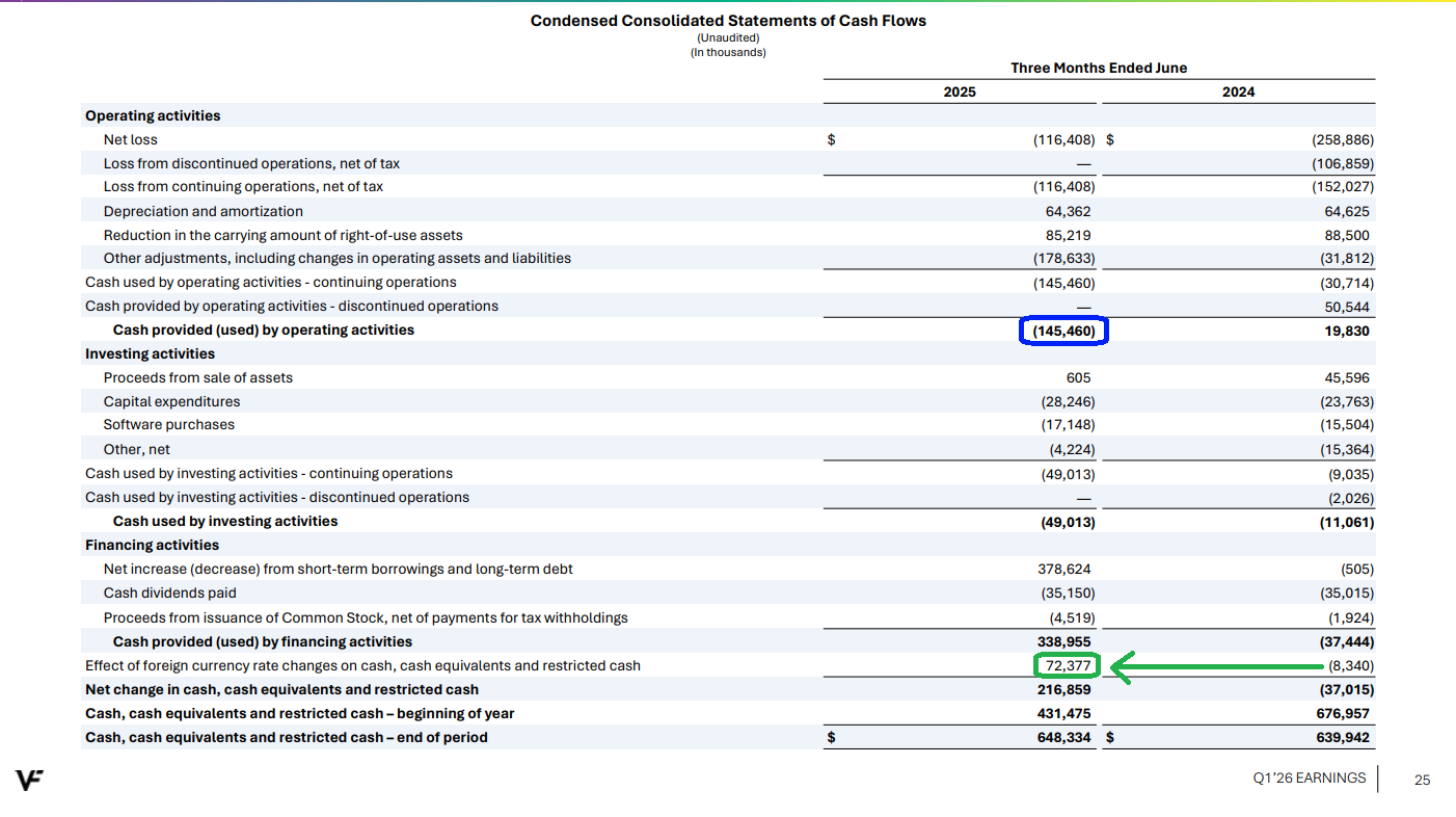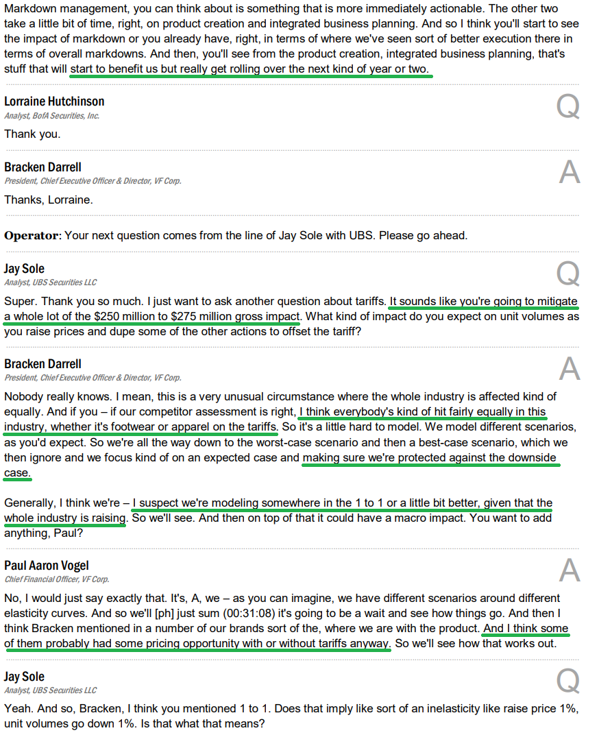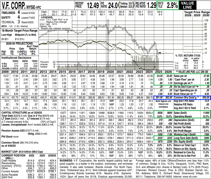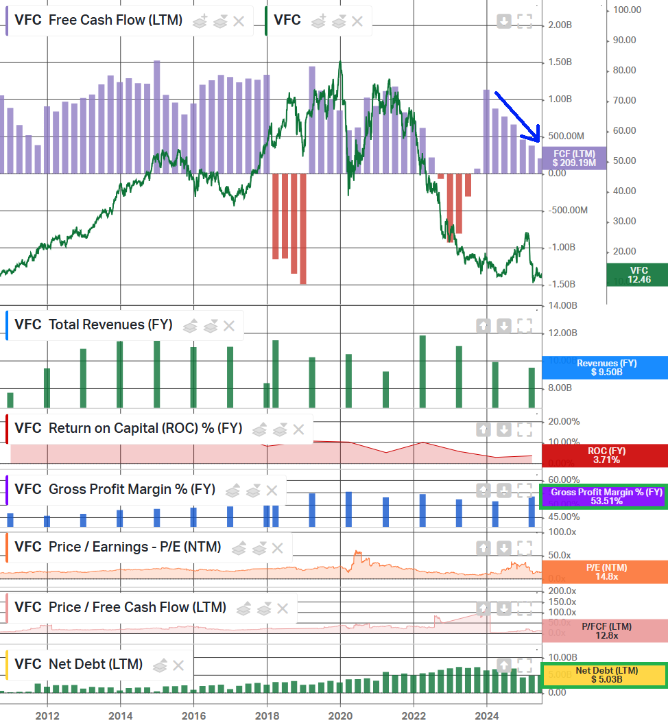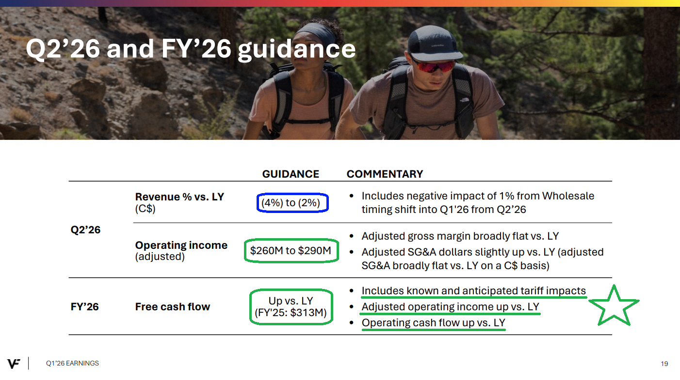 4) Net debt was down $1.4 billion, or 20%, compared to last year as management remains on track to achieve the medium term leverage target of 2.5x by FY2028. VFC ended last year at 4.1x and expects to be below that by the end of this fiscal year, with the ~$500 million bond expected to be paid down at year-end using free cash flow and other short term borrowing if needed.