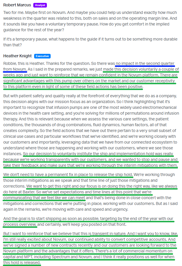 First, management voluntarily paused shipments and installations of its Novum IQ infusion platform to work with customers and address feedback. Novum was Baxter’s shiny new product with a strong backlog, already taking nearly 2 points of market share annually, and a key driver behind the 6% growth in the MPT segment last quarter.