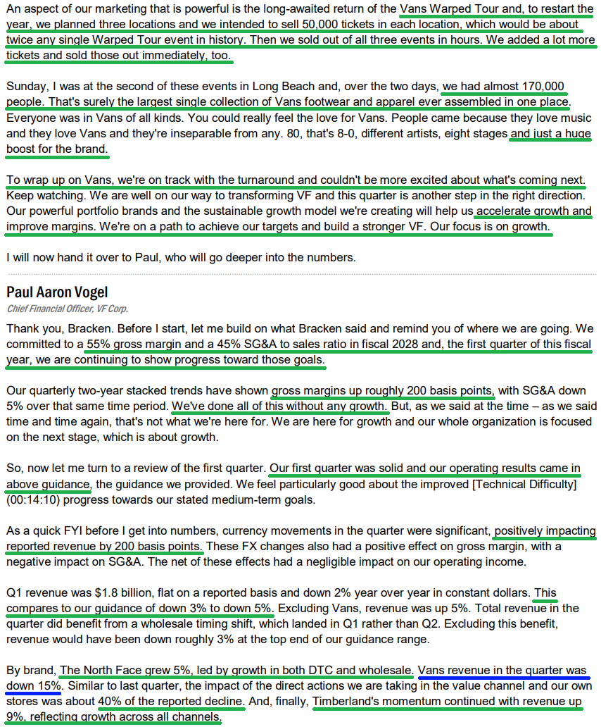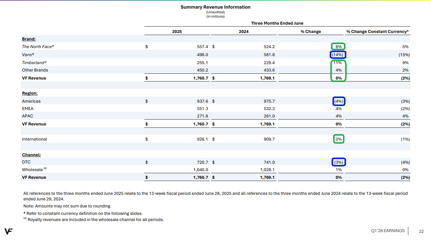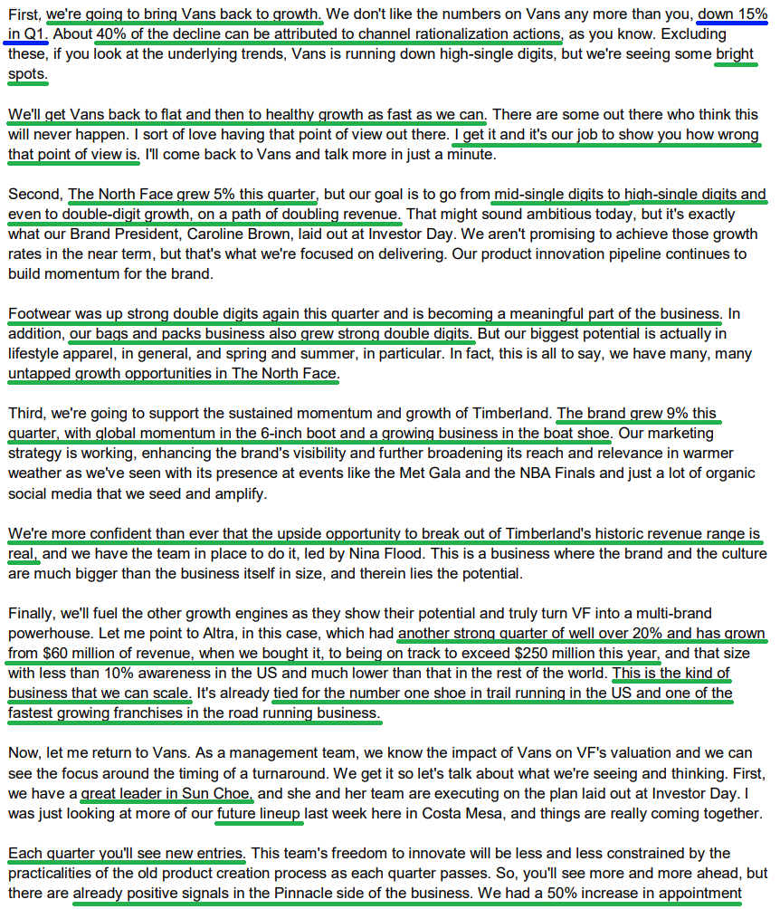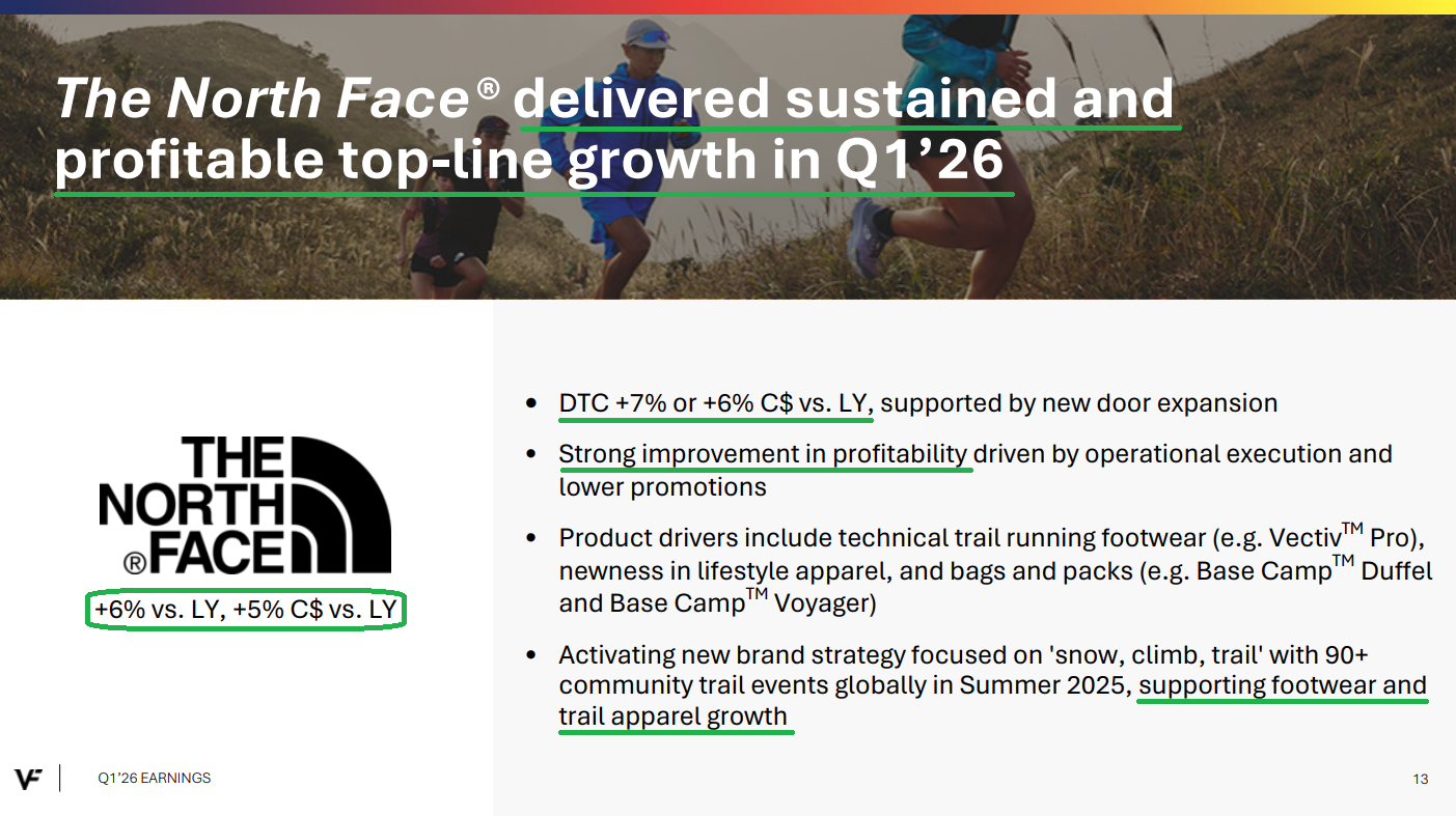 5) North Face continues to deliver solid growth, up 5% this quarter with strong improvement in overall profitability. Footwear was a standout, growing strong double digits, with bags and packs also seeing strong double digit growth. The brand remains on its path to doubling revenue over time as management works to turn it into a four-season style brand.