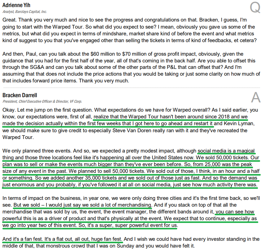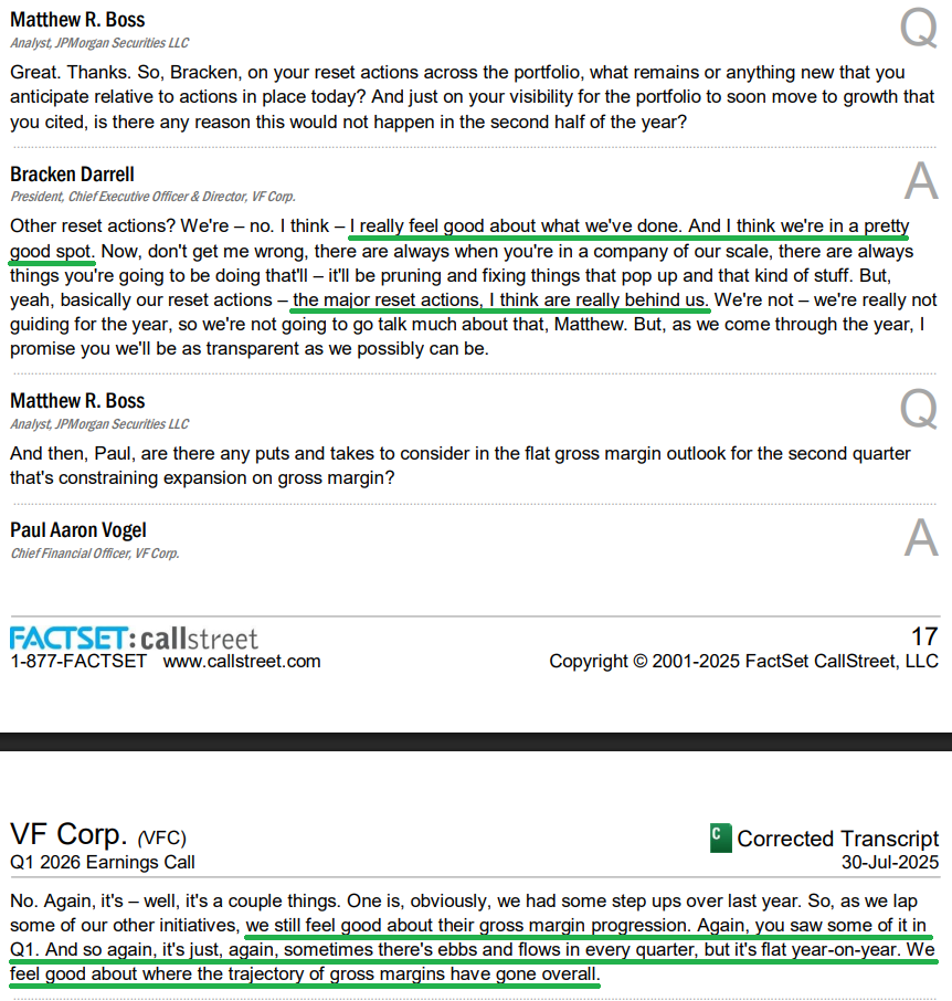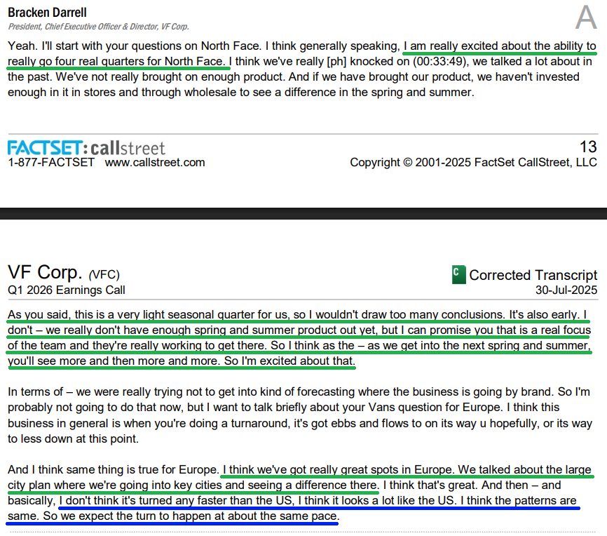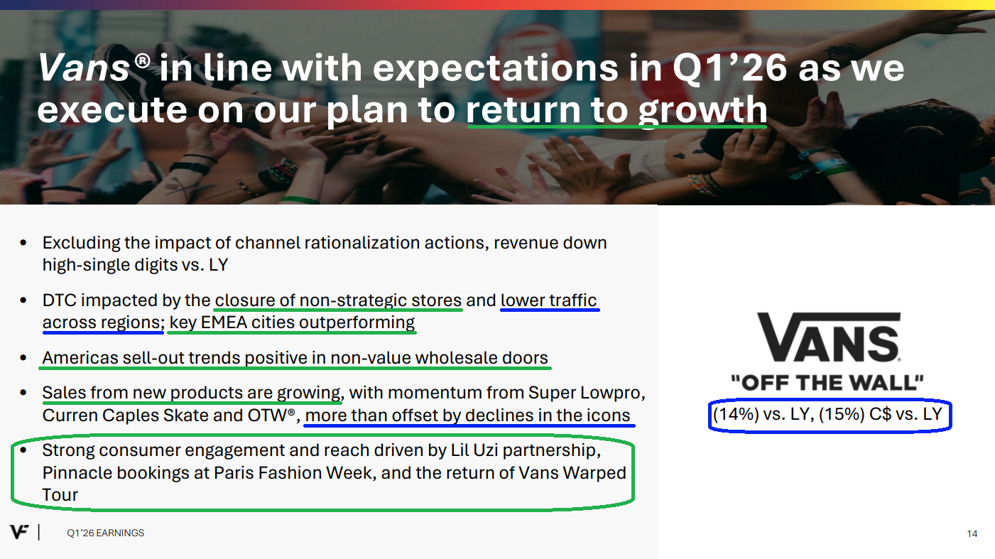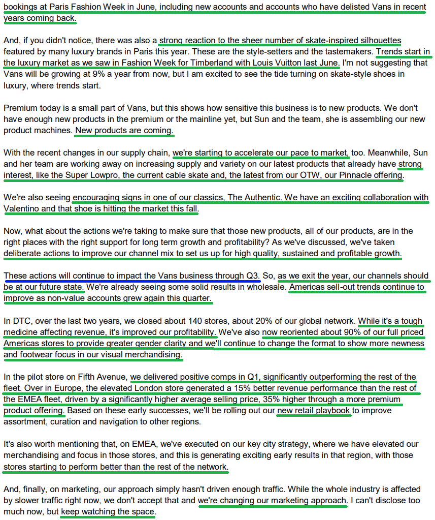 6) Vans revenues for the quarter were down 15%, with roughly 40% of the decline driven by deliberate channel rationalization. Excluding that, Vans would have been down high single digits. Management continues to see green shoots across the business, with Americas sell-out trends improving as non-value accounts grew again this quarter. Appointment bookings at Paris Fashion Week in June were up 50% as the brand leans further into premium product. New styles like the Super Lowpro and Curren Caples Skate are also driving strong sales from new products. With management optimistic about leaning into back to school marketing, an inflection point at Vans may be closer than many expect.