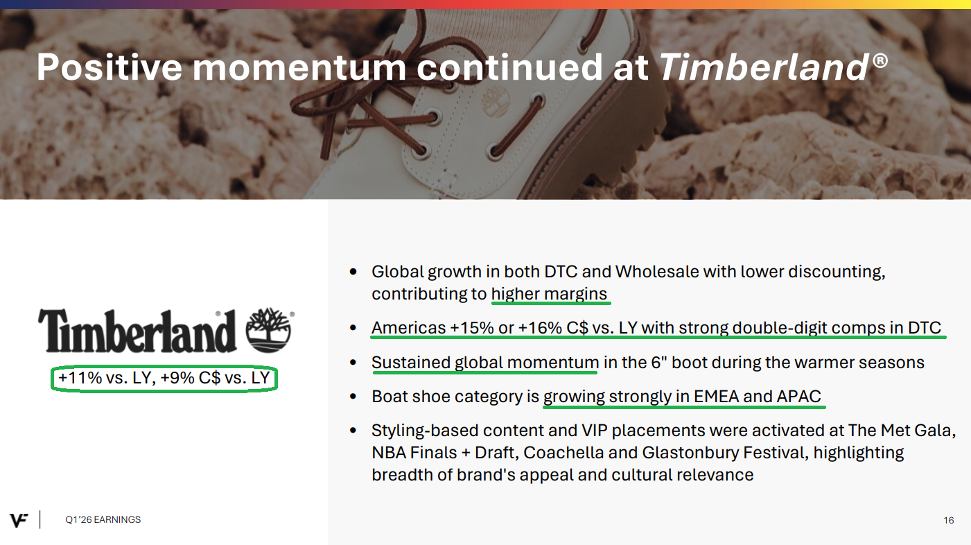 8) Timberland continues to perform well, with revenues up 9% during the quarter and higher overall margins driven by lower discounting. The brand saw growth across all channels, with Americas up 16% year over year as management remains more confident than ever about the upside opportunity to break out of Timberland’s historical revenue range.
