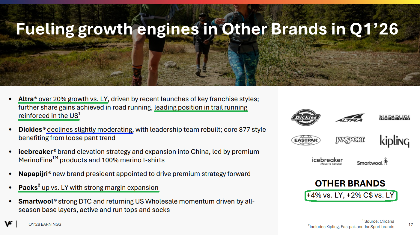9) Other brands grew 2% during the quarter, led by Altra which grew over 20% year over year as it maintained its position as the #1 trail running shoe in the US and continued gaining share in road running. When VFC acquired Altra in 2018, the brand was generating $60 million in revenue. This year, it is on track to exceed $250 million as management continues to scale the business.