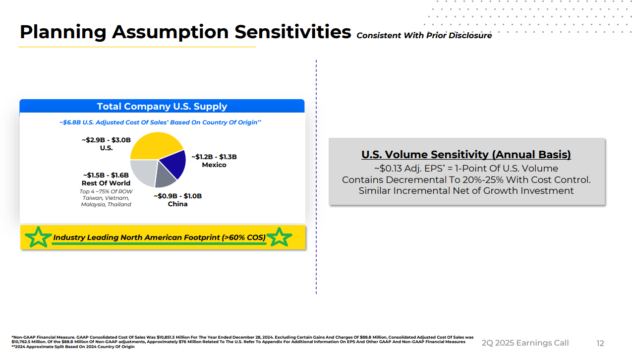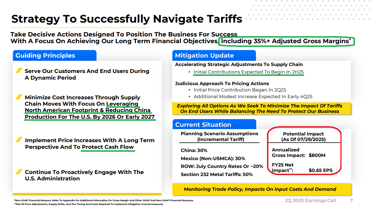 5) Management expects an annualized gross tariff cost of ~$800 million in 2025, excluding any mitigation actions. However, several mitigation and pricing strategies are already underway. An initial price increase implemented in April is fully in place, with another modest increase planned for early Q4. Management is also working to increase USMCA compliance in Mexico (~18% of the U.S. supply footprint) and sees no structural barriers to reaching industry-average levels. In addition, the current plan aims to reduce Chinese production (~14% of the U.S. supply footprint) to under 5% by the end of 2026. Combined, these efforts are expected to reduce the actual tariff impact in 2025 to just 60–65% of the $800 million, with management expecting to largely offset the entire headwind by the end of 2026.