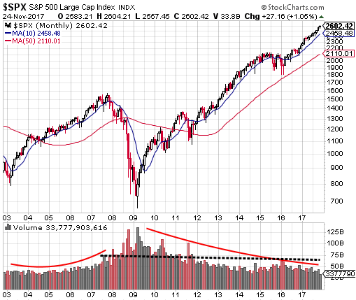 One missing aspect with the market today is the lack of slowly increasing trading volume like what occurred in the run up to the market top in 2008 and seen in the above monthly market chart. However, the lack of any significant market pullback since mid year 2016 is certainly representative of investors being content with "buying on the dips."