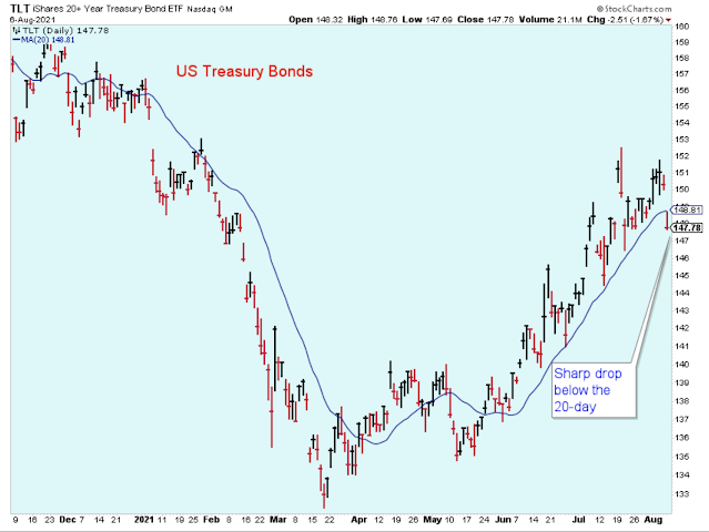 Treasury Bonds reacted immediately to the strong jobs report with a sharp decline that sliced below the 20-day. Now, the short-term trend for bonds certainly looks lower, and we should be on watch for a change in the larger trend. Not too surprising was Friday's jump in bank stock prices, and next week we should be watching all the rate-sensitive and inflation-sensitive stock prices to see if they follow the banks higher.