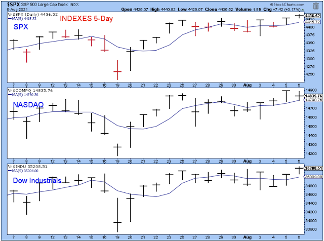 As mentioned above, the market was weakening on Wednesday with the Dow having a bad day, but by the end of the week, the indexes recovered and closed above their 5-day averages. I would have preferred to see a strong close similar to Thursday for the Nasdaq, but with the strong jobs report, we are probably seeing another shift away from Nasdaq stocks to the NYSE.