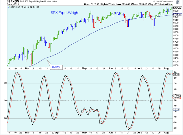 The SPX equal-weight broke out of its consolidation into new highs, although it did stumble a bit and it isn't yet convincing. Also, the momentum indicator has peaked, which means that even if the index continues to move higher, it will probably be a choppy advance.