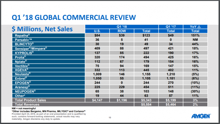 The following image shows the performance of Amgen’s product portfolio for the 2018 first quarter.
