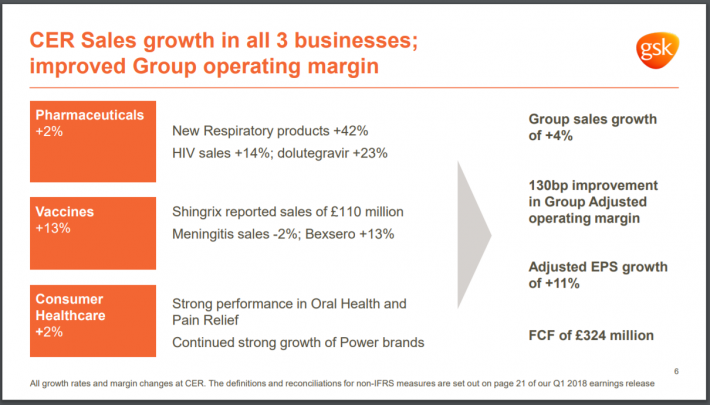 Sales for each division of the company were up during the quarter, with pharmaceuticals growing 7%, vaccines up 12%, and consumer healthcare up 8%. GSK’s shingles vaccine Shingrix, which launched in the first quarter, generated sales of $153 million, which was well above expectations. Shingrix has been recommended by the Central for Disease Control for use in patients 50 years and older. The vaccine has received the necessary approvals in Japan and Europe, so sales growth should continue.