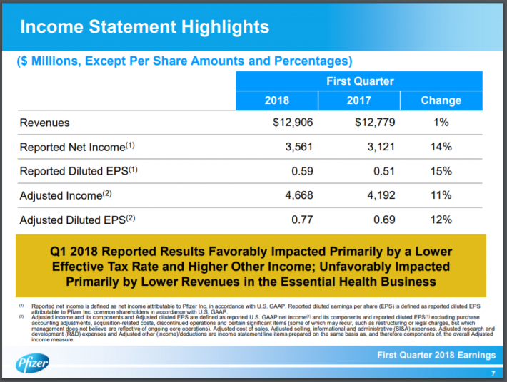 Eliquis, which we discussed earlier, saw solid growth, while breast cancer treatment Ibrance grew sales by 35%. Revenue for Pfizer’s rheumatoid arthritis treatment, Xeljanz, rose by 29% in the first quarter. These gains were partially offset by the loss of exclusivity of Viagra at the end of 2017 in the U.S., and beginning of 2018 in Canada.
