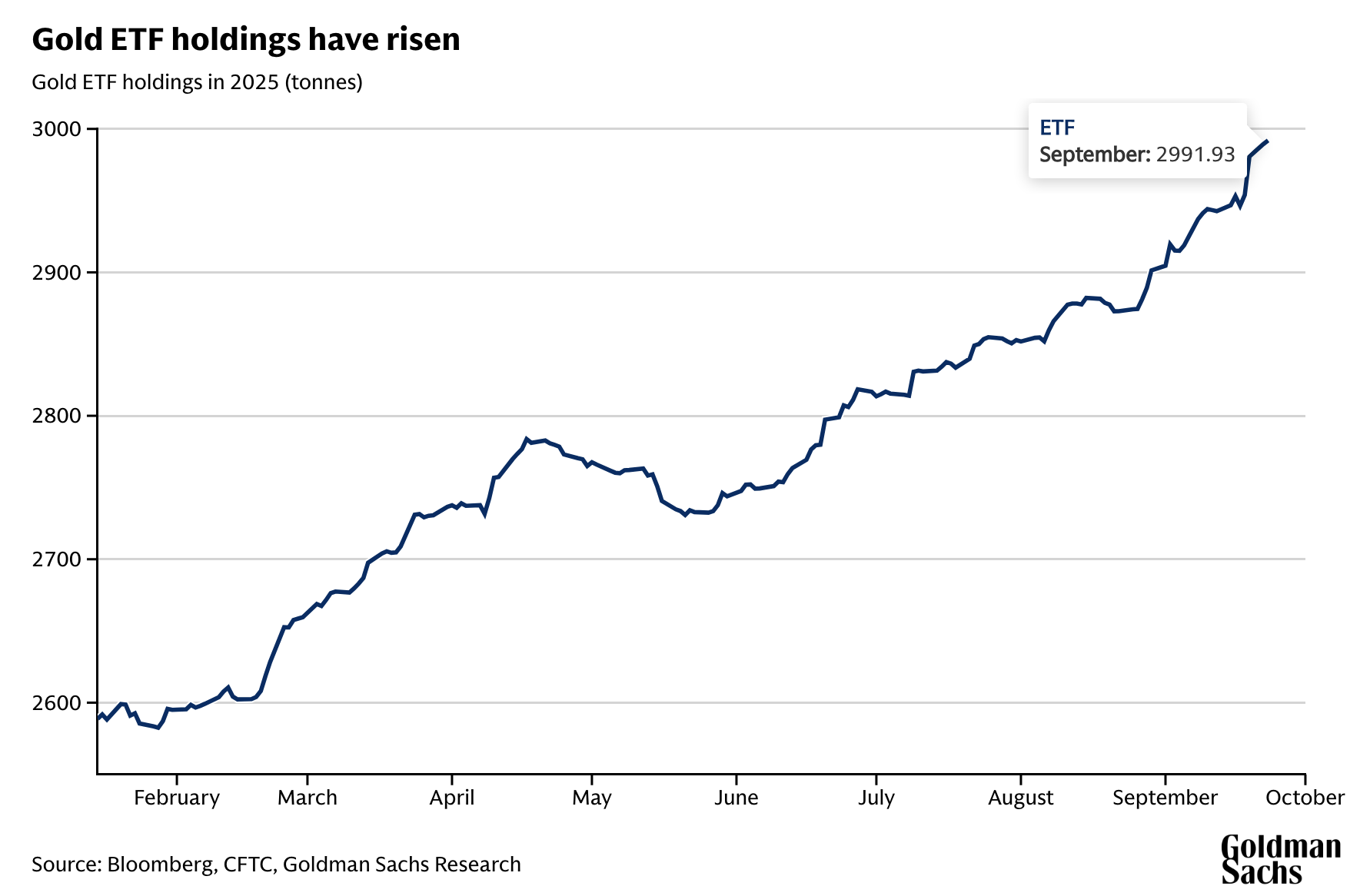 Goldman Sachs Research is now calling for bullion to stretch another leg higher, pencilling in a 6% gain through mid-2026. In their latest note (Sept. 24), analyst Lina Thomas points out that fresh demand from central banks and ETF inflows — the same heavy hands that have been driving the tape all year — remain the backbone of this rally.