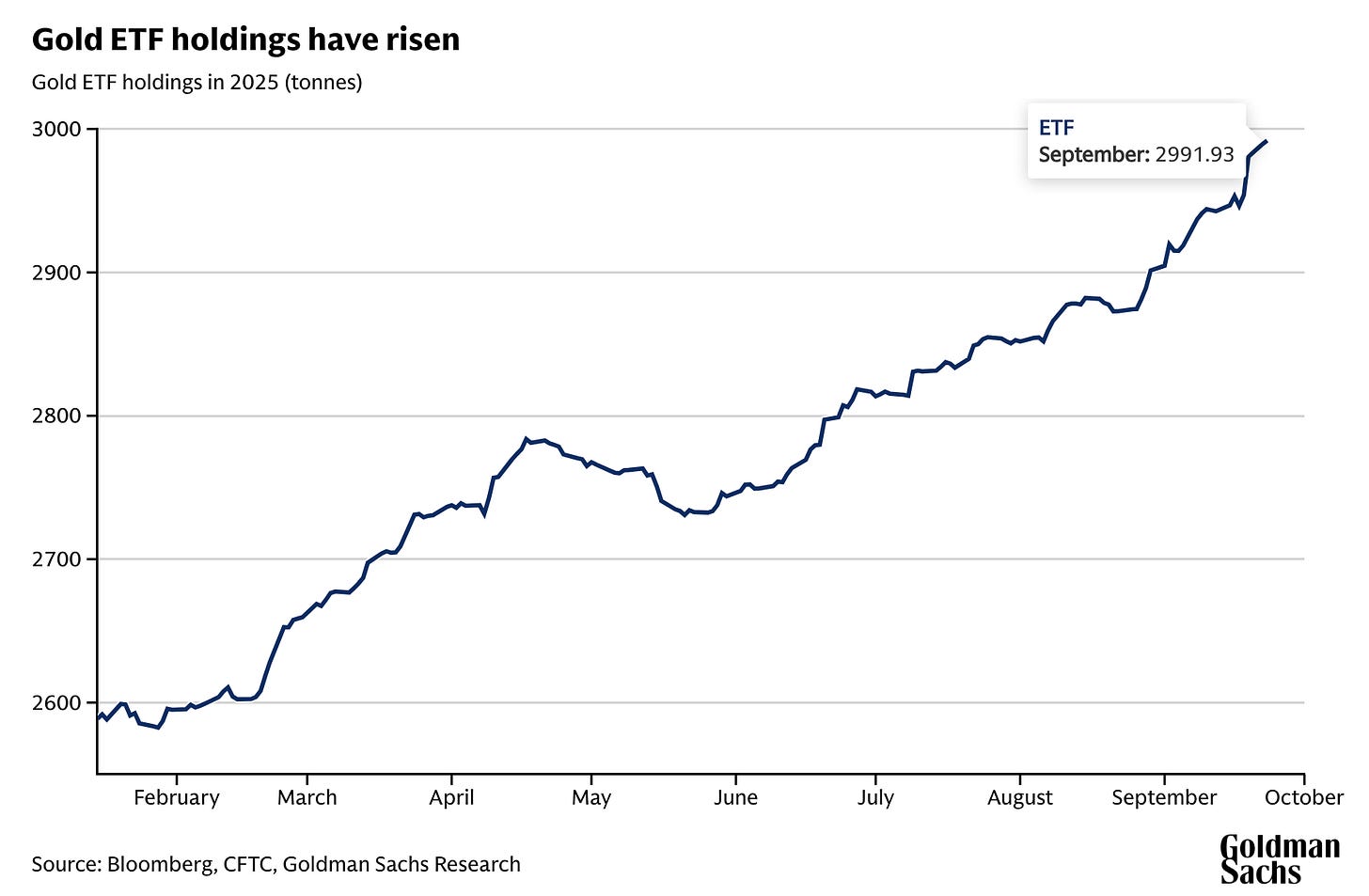Meanwhile, volatility has drained from every corner of the market, with the VIX receding as if investors believe the script is already written: slower growth, easier policy, AI as a growth driver, and gold as a safety net. Gold has surged more than 40% this year, its third straight double-digit gain, and sits on track for $4,000 by mid-2026 if Goldman’s arithmetic holds. Its bid is split between conviction buyers—central banks, ETFs, speculators—whose steady flows act like a rudder, and opportunistic households in emerging markets who step in at perceived bargains, setting the floor and ceiling. Every 100 tonnes bought pushes the price nearly 2% higher, a mechanical translation of belief into price.