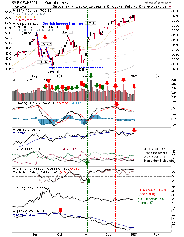 The S&P similarly sold off on heavy volume with a fresh 'sell' trigger in On-Balance-Volume to follow that of the MACD.