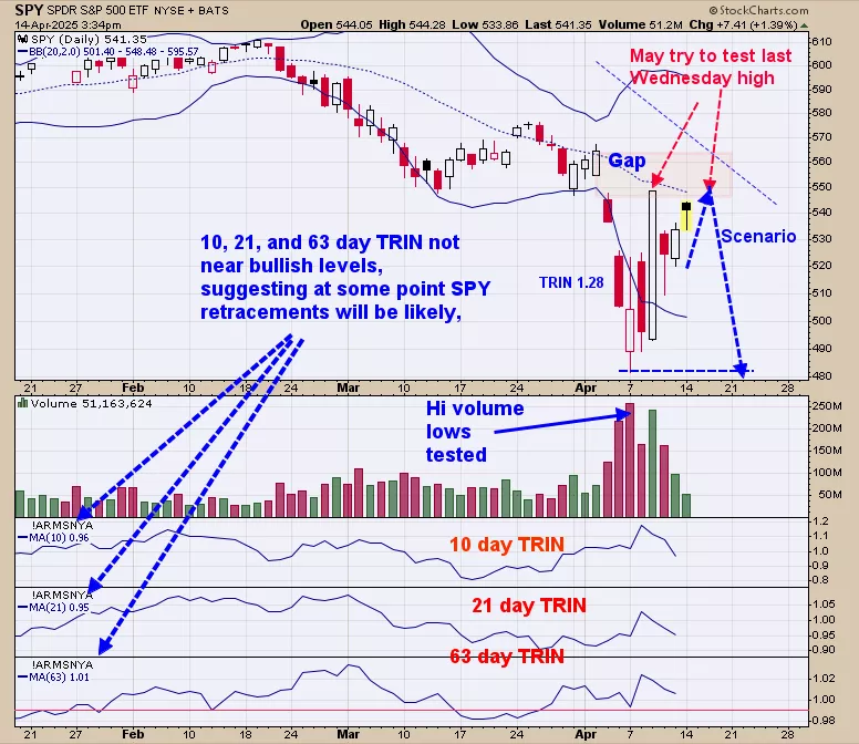 We ended up 29.28% for 2024; SPX up 23.67% for the year. SPY may be attempting to test last Wednesday high near the 550 level. The 10, 21 and 63 day TRIN are not near bullish levels suggesting the test may produce resistance and especially if the test comes on lighter volume. At some point the market may retrace back to last Monday’s low near SPY 480 range. Monday’s low had high volume and most high volume lows are tested. Staying neutral for now.