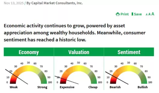 Capital Market Consultants (CMC) regularly publishes their Capital Market Indicators that provide insights into what lies ahead. The November 13 version warns on all three metrics as follows: