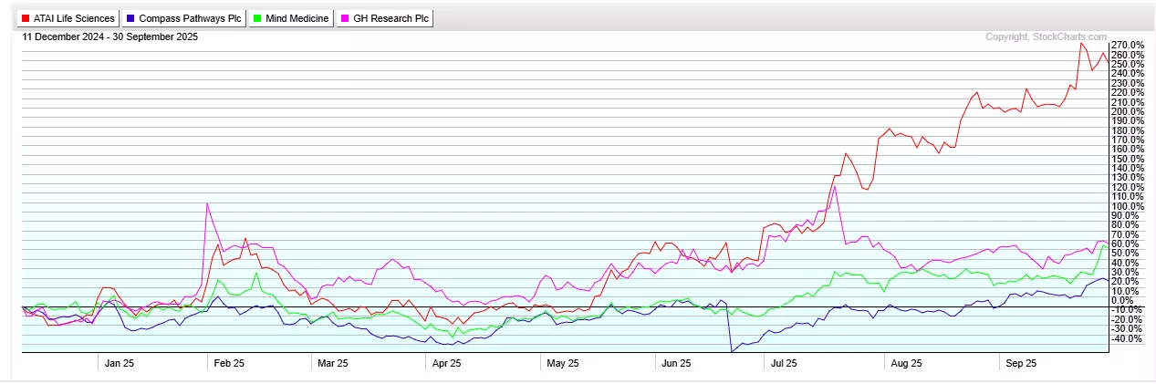 - ATAi received positive Phase 2a trial results for its intranasal psilocybin therapy for treatment-resistant depression validated BPL-003’s efficacy and safety, paving the way for Phase 3 trials in 2026, which could be transformative for ATAI’s valuation.