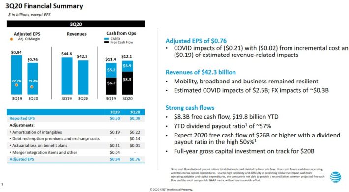 In the 2020 third quarter, AT&T generated revenue of $42.3 billion, along with operating cash flow of $12.1 billion. Among the highlights, AT&T recorded more than 5 million total domestic wireless net adds along with over 1 million postpaid net additions. The company’s postpaid churn was an impressive 0.69% for the quarter.