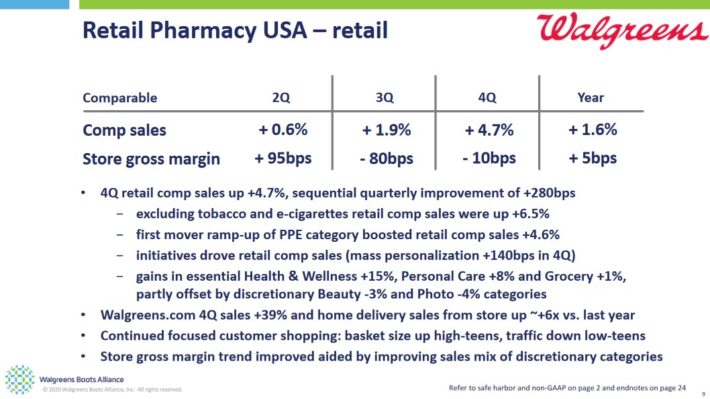 For the fiscal year, sales increased 2.0% to $139.5 billion. Adjusted operating income decreased -24.9% to $5.2 billion, while adjusted earnings-per-share totaled $4.74, down -20.6% year-over-year but ahead of previous guidance of $4.65 to $4.70. This included an estimated -$1.06 adverse impact from the COVID-19 pandemic. In addition, Walgreens introduced fiscal 2021 guidance, anticipating low single-digit growth in adjusted EPS%.