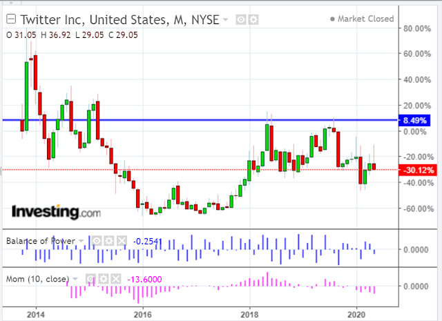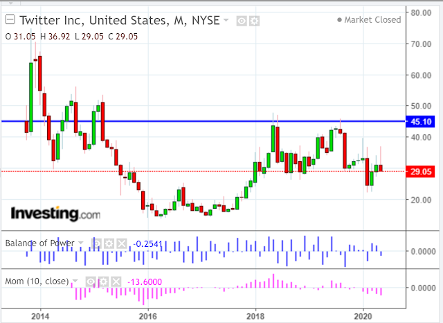 Twitter (TWTR) is still below its IPO opening price of 45.10 (November 7, 2013), as shown on the following monthly chart. In fact, it's 30% below, as shown on the second chart.