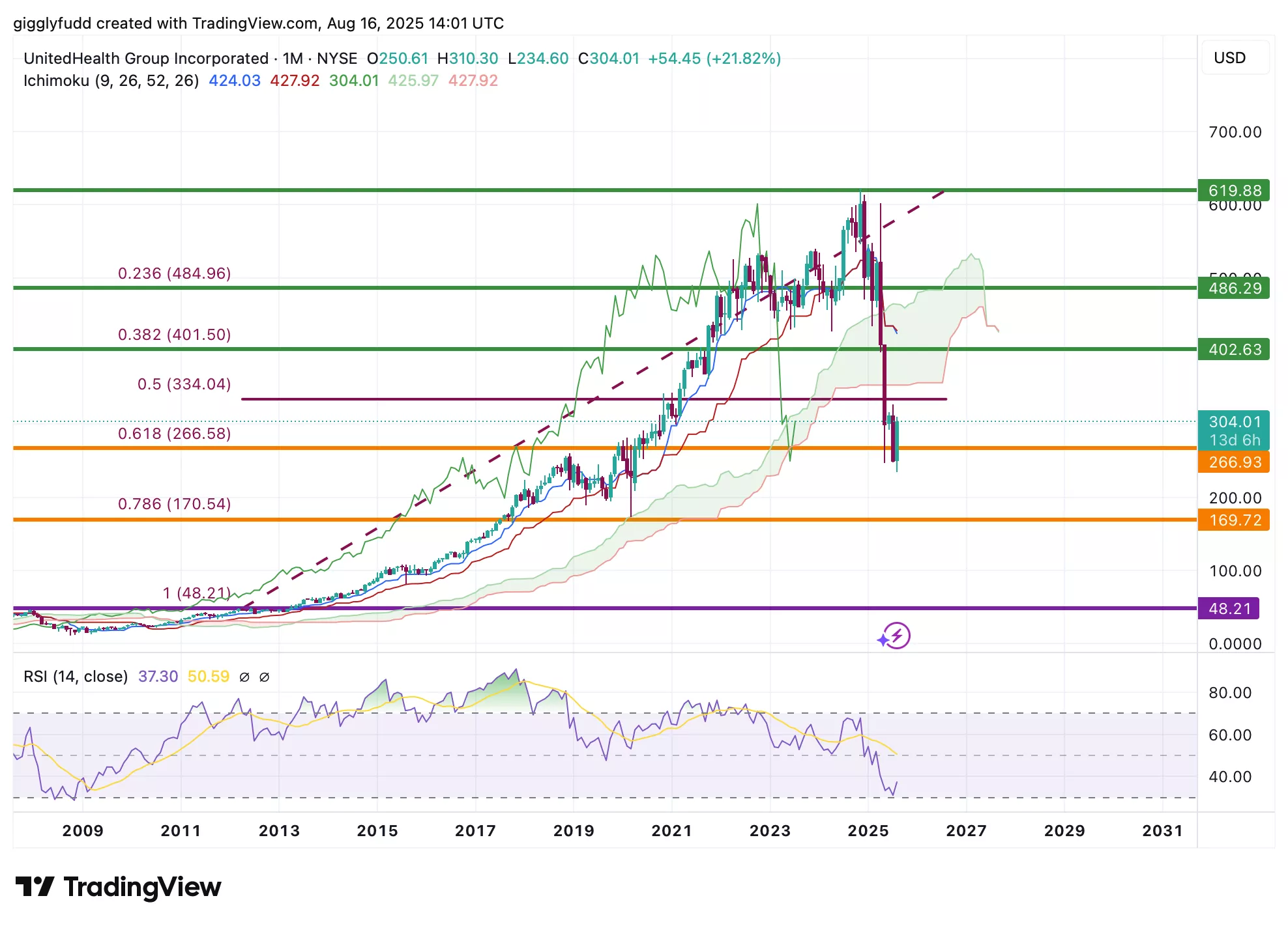 On the weekly chart, UNH had been rising steadily until December 2024, when it began a sharp decline, retracing as much as 61% on the Fibonacci retracement level.