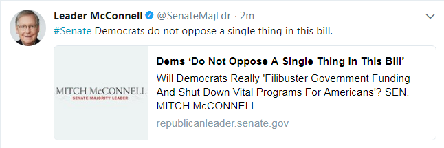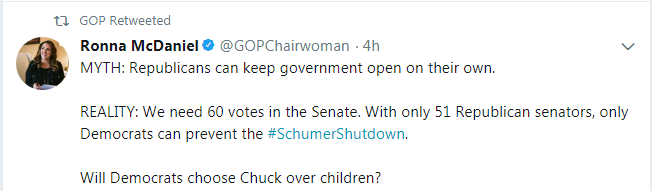 This shutdown is #Trump's doing. No one will remember Chuck, but all will remember the Donald. If Trump wants a deal he needs to negotiate. He didn't have to negotiate the trillion dollar welfare package for business, but now it is back to the nuts and bolts of running the government. Democrats cannot trust the Republicans because they have gained no trust.
