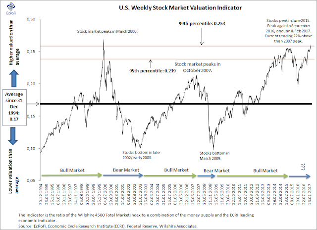 Yesterday, this simple stock market valuation indicator, calculated as the Wilshire 4500 stock market index divided by a combination of the money supply and the ECRI leading economic indicator, climbed into the 99th percentile based on data going back to 1987.