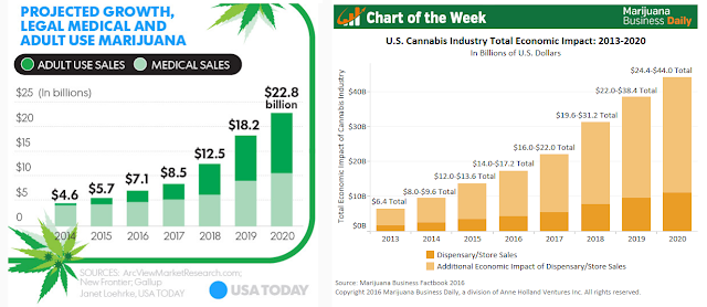 In the U.S., 29 states and Washington, DC allow for the use of medical or recreational marijuana in adults. The increasing number of states allowing either medical or recreational marijuana use is leading to a boom in sales growth for the industry. ArcView Market Research forecasts legal use of marijuana will hit $22.8 billion in 2020. Marijuana Business Daily projects the full economic impact of marijuana decriminalization, which includes sales of both marijuana and peripherals, could hit $44 billion by 2020 (19).