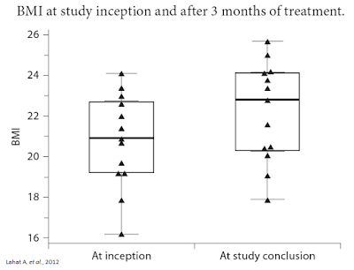 Separate research published in Digestion in 2012 by Lahat A. et al., examined 13 subjects with long-standing IBD who were prescribed cannabis as part of their treatment regimen. After three months of treatment, researchers saw significant improvement in quality of life scores, including an improvement in general health perception (p = 0.001), social functioning (p = 0.0002), ability to work (p = 0.0005), physical pain (p = 0.004) and depression (p = 0.007). A schematic scale of health perception showed an improved score from 4.1 ± 1.43 to 7 ± 1.42 (p = 0.0002). Patients had a weight gain of 4.3 ± 2 kg during treatment (range 2-8; p = 0.0002) and an average rise in BMI of 1.4 ± 0.61 (range 0.8-2.7; p = 0.002). The average Harvey-Bradshaw index was reduced from 11.36 ± 3.17 to 5.72 ± 2.68 (p = 0.001) (27).