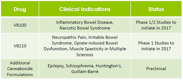Vitality Bio is currently conducting preclinical studies in anticipation of filing IND applications in 2017 for glycosylated cannabinoid products called cannabosides. The most advanced candidate is VB100, a cannaboside prodrug under development for the acute management of inflammatory bowel disease. A second candidate, VB210, is under development for chronic conditions that affect both the GI and CNS. I will perform more detailed analyses on both these candidates in the coming months. The key differentiating factor to the two pipeline candidates is the oral mode of administration, which specifically targets the gut and reduces the potential for psychotic / psychotropic side-effects associated with medical marijuana or systemic cannabinoids.