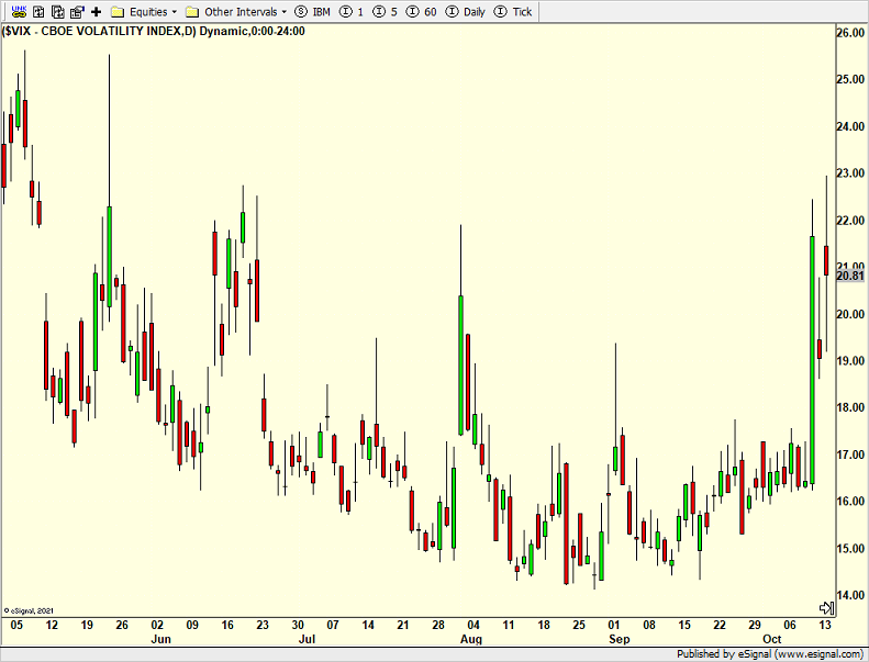 Volatility has certainly increased. From less than 15 to over 22. That’s almost 50% in short order. Stocks are in the midst of the mild pullback I have written about. 2-5% is the range on the downside. Weakness remains buyable.