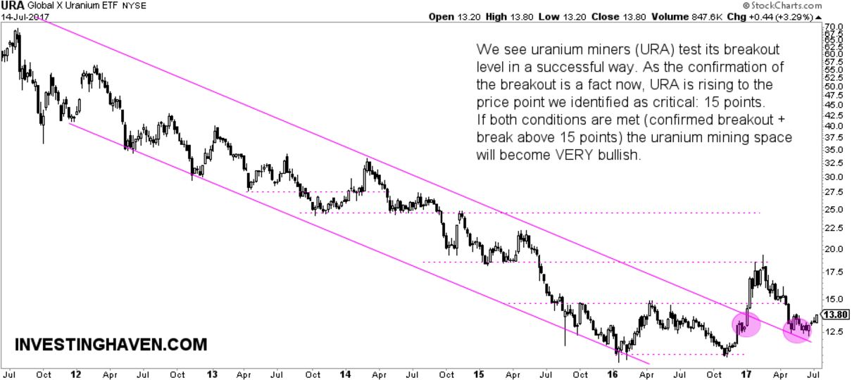First, URA ETF saw a breakdown in May. In June, uranium stocks did something that is quite exceptional: it started a beautiful bottoming pattern and tested its breakout trend line (see the uranium stocks chart here). This is what we wrote yesterday: “Not only is June’s bottom a higher low compared to the ones of January and October 2016. More importantly, we just got a confirmation of the breakout, see the purple circle (the one right above the trendline). The breakout is now confirmed, and we interpret this as a new bull market in uranium miners!”