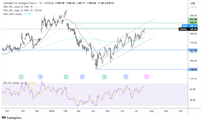 GOOGL has traded within a rising channel since April, encountering resistance at 185. The RSI is above 50, indicating further upside potential. Buyers will look to rise above 185 to push towards 190, the rising trendline resistance, and the February high. Above here 200, comes into play.