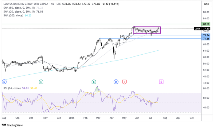 The share price recovered from the 50.70 2025 low, rising to a peak of 78.75, before easing lower. The price is consolidating around 77p. Buyers will look to break out above 79.20 to bring 80, a psychological level last seen in 2008, into focus.