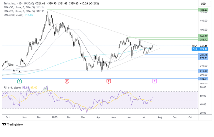 Tesla trades below its falling trendline dating back to the December 2024 high, and the price has recovered from the 214 low, trading symmetrically in a triangle. The price has lifted off the rising trendline support, pushing above the 200 SMA. Buyers will look to rise above the falling trendline at 337 and 356, the June 24 high, and 365, the May high. On the downside, support is at 316. If the price breaks below here, bring the rising trendline support at 305 into focus. A breakout of the triangle brings the July low of 290 into play.