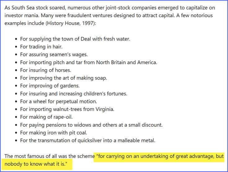 And this is the same behavior observed before the infamous South Sea Bubble of the 1700’s blew up. My favorite pitch for South Sea shares?