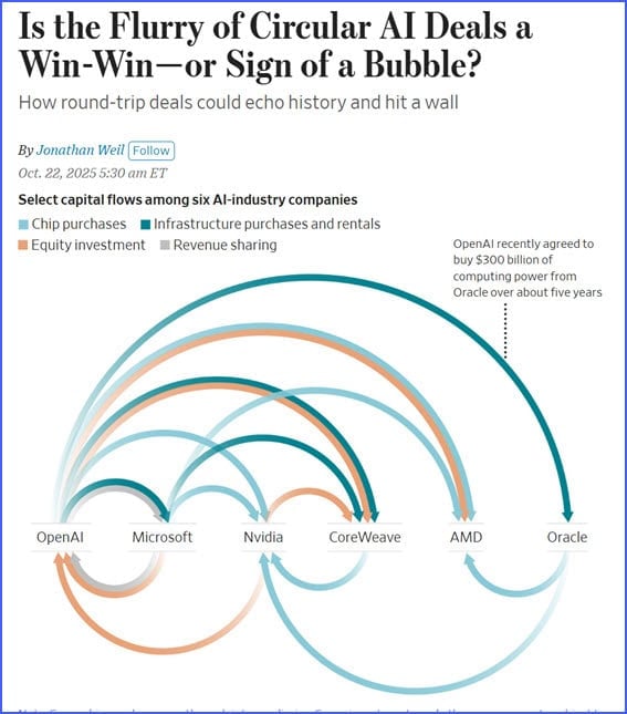 The AI bubble has gotten so massive and so complicated and so perversely organized that even the WSJ is having trouble figuring out how to describe the circular deals and money flows.
