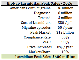 I'll start by assuming 3 million patients on therapy by 2020. I assume the average migraine sufferer has 4 episodes per month or 50 episodes per year. I think this is the level at which a patient will seek medical attention. If we price lasmiditan at parity to Treximet® at $80 per pill, the yearly cost per patient, assuming 100% compliance (a false premise), is $4,000. This would suggest a peak market of $12 billion.