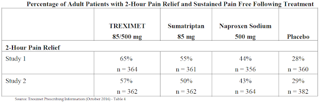 The most recent migraine study we can compare the SAMURAI data to is the Treximet clinical program conducted by Pozen/Glaxo roughly a decade ago (Treximet was approved in 2008). This is an excellent comparison because the study not only looked at the 2-hour pain relief of Treximet but also the individual components of sumatriptan and naproxen.