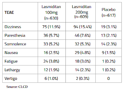 Lasmiditan was well tolerated, with the majority of treatment-emergent adverse events (TEAE) being nervous system related, and 91% of TEAE in lasmiditan treated patients being described as mild or moderate in nature. Importantly, there was not a significant increase in cardiovascular adverse events in patients who dosed with lasmiditan versus placebo. There were no serious adverse events in SAMURAI that were considered to be related to treatment. The following table sets forth the percentage of patients who experienced the specified adverse event within the safety population for each dose.