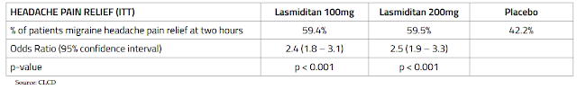 At the European Headache and Migraine Trust International Congress (EHMTIC 2016) in Glasgow, Scotland on September 17, 2016, CoLucid provided an additional analysis of the primary endpoint, this time reporting intent to treat (ITT) data on the percent of patients with migraine headache pain relief, defined as moderate or severe headache pain at baseline reduced to mild or no headache pain at two hours post-dose. The results show strong statistical significant in favor of lasmiditan.